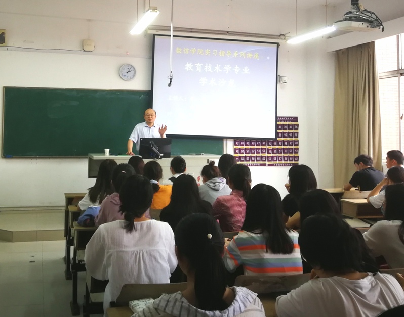 张一春教授以“我看教育技术——新时代的教育技术再出发”为主题,结合教育技术学专业员工面临的现实困惑,从“教育技术是什么?”、“教育技术能做什么?”、“教育技术做了什么?”等角度与大家探讨了教育技术学专业的现状与面临的挑战。张教授用幽默生动的语言、通俗易懂的案例帮助员工深入理解了教育技术专业的内涵、定位和应用,促进员工们更好地认识和思考教育技术专业的发展,整场报告内容生动而深刻。随后,张教授与现场师生进行了互动交流,对同学们提出的有关考研、就业、专业竞赛等问题进行了耐心详细的解答。