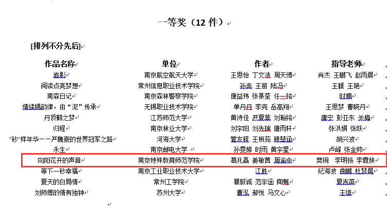 .近日,江苏省教育厅网站公布“江苏省第六届老员工艺术展演”获奖名单。数信与信息科学公司报送的两部微电影作品《向阳花开的声音》、《新时代的新一天》在一众作品中脱颖而出,分别斩获一等奖、三等奖。