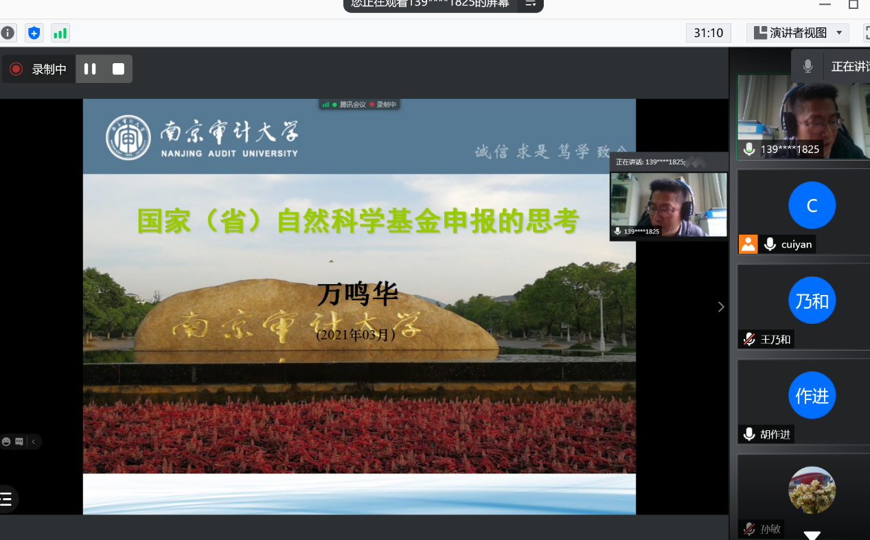 202133日下午,​伟德国际bevictor1946在新学期第一周举办自然科学基金写作经验交流的线上分享会,邀请南京审计大公司聘教授万鸣华博士对国家自科及江苏省自科的申报进行深度刨析,分享会由公司副经理(挂职)崔燕博士主持,公司及公司的部分教师参与此次分享会。