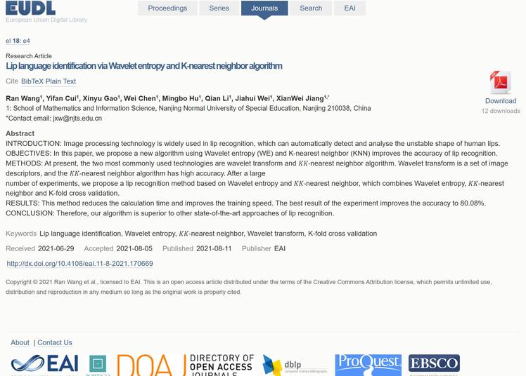 近日,公司王冉、崔艺凡、陈威、胡明波、李茜、高心语、魏佳慧等同学采用小波熵和k近邻算法实现了对唇语图像的初步识别,撰写了题为“Lip Language Identification via Wavelet Entropy and K-nearest Neighbor Algorithm”的学术研究论文。