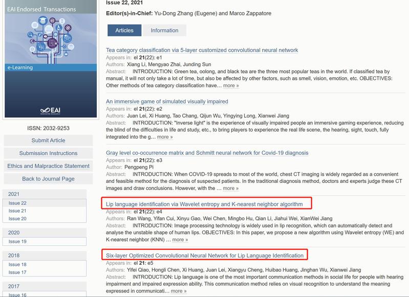 这两篇文章基于迁移学习的思想,借助了已有的研究积累,伟德国际bevictor1946两个团队的同学们,将手语图片识别的方法和模型运用到唇语识别上,进行了大胆的尝试,最终取得了成果。目前,这两篇论文已经被欧洲学术期刊e-Learning出版。(蒋贤维)