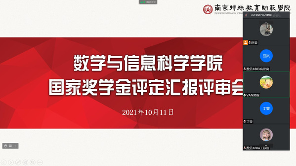 10月11日,伟德国际bevictor1946于线上开展2020-2021学年国家奖学金评定汇报评审会议。本次评审会由数信院辅导员樊琬老师主持,公司党总支副书记丁雯和全体辅导员组成奖学金评审小组参与了会议。