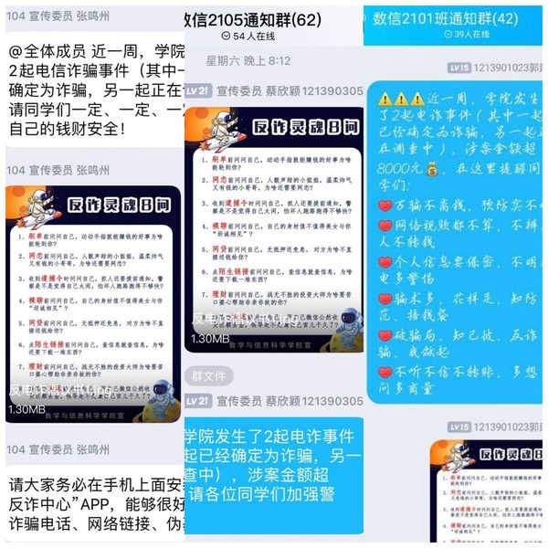 近日,高校电信诈骗事件频发,新型电信诈骗的手段也层出不穷,接踵而来,为进一步提高公司新生对于电信诈骗的防范意识,保护同学们的财产安全,杜绝此类问题的发生。3月26日-4月初,21级新生班级陆续开展一系列反诈骗主题线上宣传教育活动。活动由各班宣传委员主持,党总支副书记丁雯、辅导员张国盛及全体员工参与。