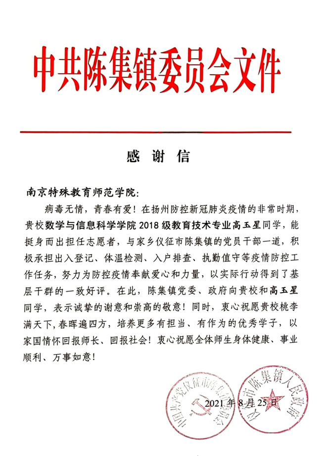 感谢信中写道:病毒无情,青春有爱!在扬州防控新冠肺炎疫情的非常时期,贵校伟德国际bevictor19462018级教育技术专业高玉星同学,能挺身而出担任志愿者,与家乡仪征市陈集镇的党员干部一道,积极承担出入登记、体温检测、入户排查、执勤值守等疫情防控工作任务,努力为防控疫情奉献爱心和力量,以实际行动得到了基层干群的一致好评。在此,陈集镇党委、政府向贵校和高玉星同学,表示诚挚的谢意和崇高的敬意!同时,衷心祝愿贵校桃李满天下,春晖遍四方,培养更多有担当、有作为的优秀学子,以家国情怀回报师长、回报社会!衷心祝愿全体师生身体健康、事业顺利、万事如意!
