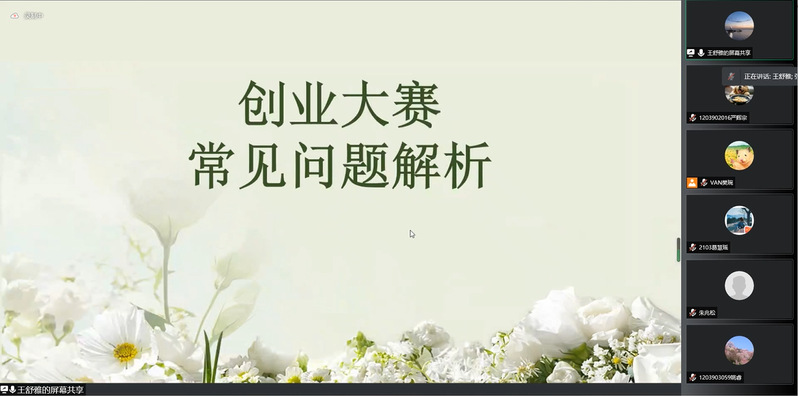 会议开始前,辅导员樊琬老师带领同学们学习了“双创”大赛相关文件要求,强调了关键的注意事项、提交材料的时间节点等。张经理向同学们介绍了王舒雅教授的部分研究成果和个人事迹。王舒雅教授以2020年全国“互联网+”老员工创新创业金奖项目“江海廉友廉洁文化传播项目——打造新时代互‘廉’网”为切入点,向同学们展示了参赛项目ppt与计划书,用“为什么要做”、“为什么能做”、“需要做什么”、“做得怎么样”几个问题串联了参赛材料的各项关键要素,并对常见问题进行了解析,用“四看”、“三最”总结出创新创业比赛前期选题与准备的要点。