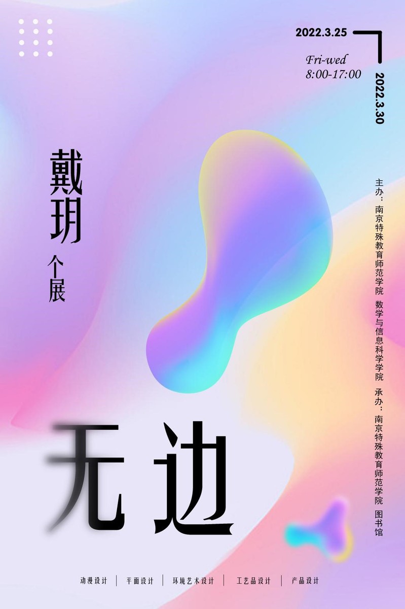 3月25日,伟德国际bevictor1946戴玥老师的个人艺术作品展在图书馆二楼展厅举办。本次展览主题为“无边”,共展出了戴玥近几年创作的40余幅设计作品,作品题材广泛、形式多样,涵盖了动漫设计、平面设计、UI设计、产品设计、环境艺术设计、工艺品设计等。