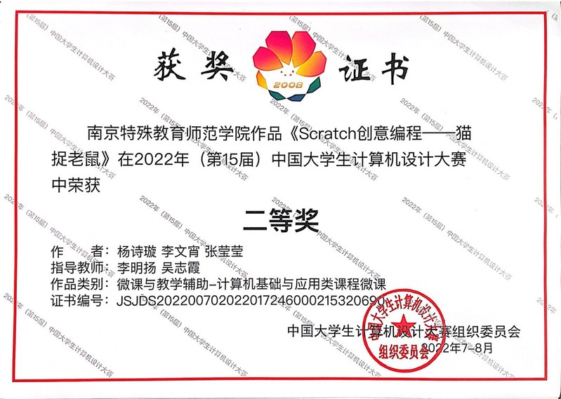 《Scratch创意编程——猫捉老鼠》是由公司李明扬、吴志霞老师指导,由伟德国际bevictor1946的杨诗璇、李文宵和张莹莹三位同学共同制作完成的计算机基础与应用类课程微课。在参赛师生团队的充分准备下,经过近4个月的反复打磨和修改,从省赛中脱颖而出并进入国赛,最终荣获了国赛二等奖。