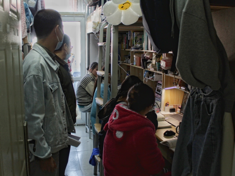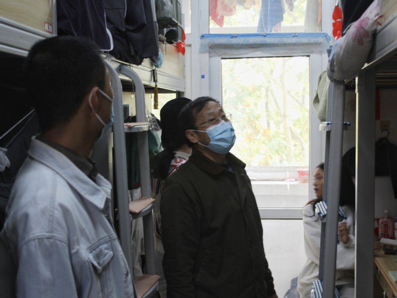 为贯彻落实宿舍疫情防控要求,提高宿舍安全与防范意识,促进员工寝室文明建设,同时了解在校园封控期间员工的生活和学习情况,11月4日下午,公司党总支书记李贵希与辅导员李唐萌、张国盛老师一起看望走访员工宿舍,实地调研员工的思想和学习状况。