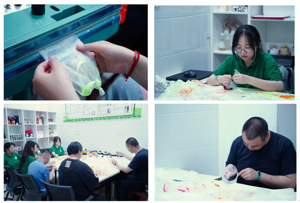随后几天的实践,“益桔同行”实践团成员对燕子矶街道残疾人之家日常运营管理、辅助性就业项目、日间照料、文体活动、安全等情况进行了调研,重点对他们一些特色品牌项目运营和宣传状况进行了详细调研。此外团队成员还加入到机构辅助性就业工作中,与机构学员相互配合制作“起泡网”。这种对于普通人只需四五秒完成的步骤,他们可能需要四到五分钟才能完成。机构的张老师表示,一名学员一小时大概只能制作二十到三十个完整的起泡网,一个起泡网大概四毛钱,制作在一定意义上更多的是帮助学员稳定情绪、锻炼手部动作、手脑协调,使康复与辅助性就业相结合,这也为团队后期项目的开展提供了新思路。