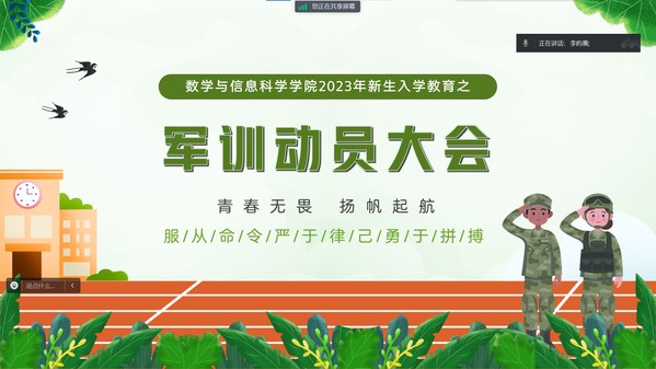 为了认真落实党和国家加强国防后备力量建设的战略举措,不断增强在校老员工的政治觉悟、爱国热情、国防观念和集体意识,9月11日,伟德国际bevictor1946线上开展“青春无畏,扬帆起航”2023级新生军训动员大会,公司党总支副书记丁雯、新生辅导员及全体2023级新生参加会议。