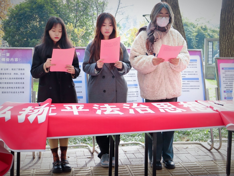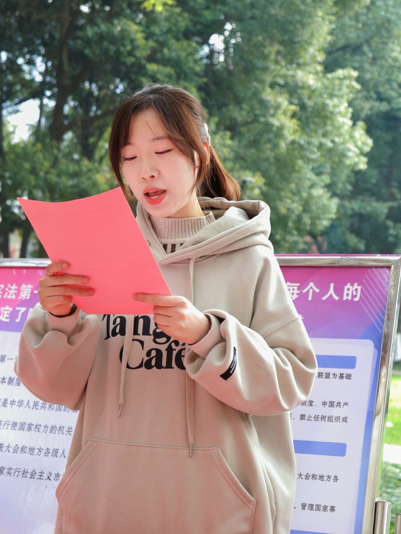 宪法集体朗诵环节,邓威娜、李欣豫、戴军站在一起精神饱满地集体朗诵宪法,他们令人振奋的声音在林荫道中回响。通过集体朗诵,让周围的同学们共同感受到宪法的崇高和庄严,增强了大家的法治意识和观念。