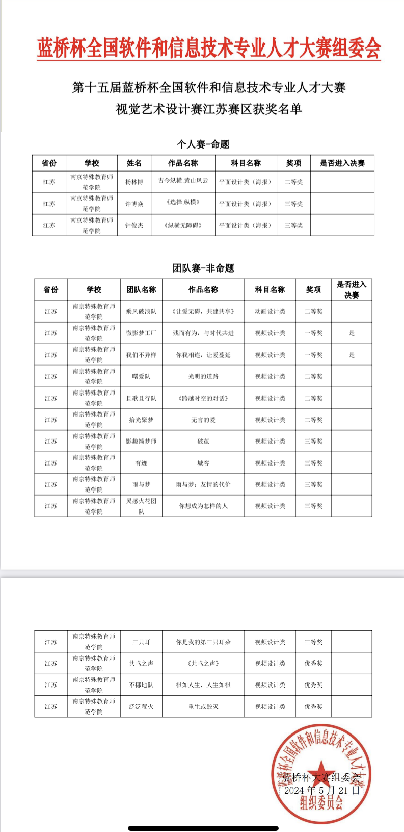 国赛获奖10项,分别是软件类二等奖1项、三等奖1项,设计赛团队赛-非命题三等奖2项,项目实战-个人赛优秀奖6项。
