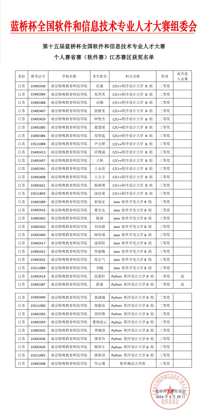 近日,全国第十五届蓝桥杯全国软件和信息技术专业人才比赛落下帷幕。公司员工个人及团队在此次赛事中取得了全国赛获奖10项、江苏省赛获奖80项的优异成绩。喜人的成绩取得受益于公司的高质量发展战略谋划和对人才培养的持续重视。尽管备赛过程周期比较长,但教师们始终辛勤付出、认真指导,员工积极准备、持续投入,比赛中展现出南京特师学子的优秀品质和良好的竞赛精神。蓝桥杯全国软件和信息技术专业人才大赛是由工业和信息化部人才交流中心举办的全国性IT学科赛事,吸引着北京大学、清华大学、上海交通大学等全国1200余所高校参赛,是高校公司产品改革和创新人才培养的重要竞赛项目。