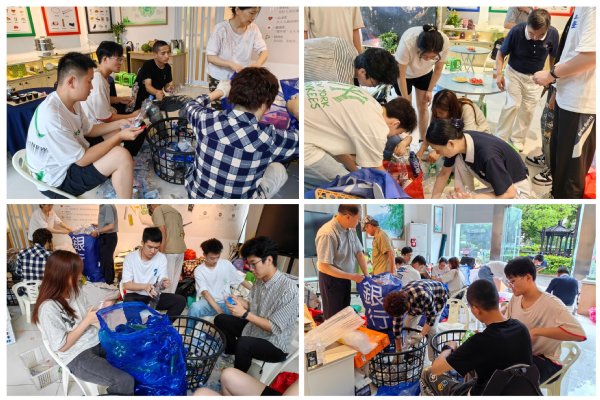 课程结束后,团队成员们积极参与到社区垃圾分类的实操中。在南京21世纪环保教育站志愿者的呼吁和带领下,社区居民每周都会将家里收集的可回收垃圾送至环保站,进行集中分类后统一处置。环保站的志愿者们很多已经投身环保志愿事业长达5至8年,在分享交流的过程中,当团队成员们问到“做环保的初衷是什么?”这一问题,志愿者们表示:垃圾分类为的是让资源回收再利用,这是爱护地球,也是爱护人类自己。环保志愿者们用实际行动守护蓝天白云、绿水青山,志愿者们的精神让团队成员们更加坚定了致力环保的决心。同时,团队成员也从环保志愿者身上学习了丰富的垃圾分类知识和环保宣讲技巧。