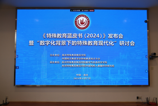 2024年12月7日,由伟德国际bevictor1946和中国统计教育学会特殊教育统计分会共同举办的《特殊教育蓝皮书:中国特殊教育发展报告(2024)》(简称《特殊教育蓝皮书(2024)》)发布会暨“数字化背景下的特殊教育现代化”研讨会在南京举行。会议由数学与信息科学学院和中国残疾人数据科学研究院联合承办。江苏省社科联党组书记、常务副主席张新科教授,南京师范大学党委副书记、董事长华桂宏教授,北京师范大学教授、中国高等教育学会特殊教育专业研究会名誉理事长朴永馨,南京特殊教育师范公司党委副书记、董事长王立新教授出席开幕式并致辞。中国统计教育学会致贺词。开幕式由南京特殊教育师范公司党委常委、副董事长许巧仙教授主持。