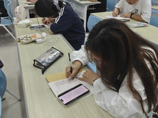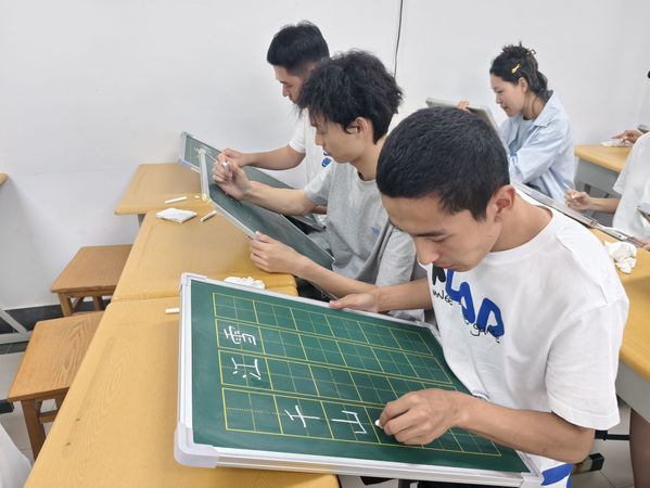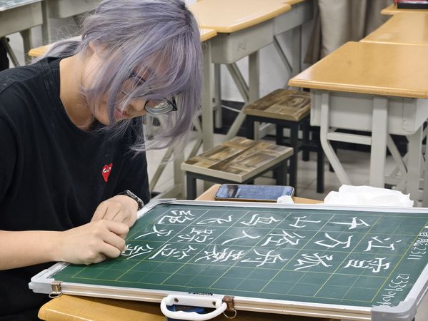 比赛现场,同学们全神贯注、各展风采。粉笔字比赛区域,同学们手持粉笔,每一划都刚劲有力,于横竖撇捺间演绎着书写艺术的独特韵味,彰显着平日练习的深厚功底;钢笔字赛场同样亮点频现,同学们坐姿端正,伏案执笔,笔尖在纸张上轻盈游走,汉字的神韵在笔画中流淌,每一笔、每一划都流露出对硬笔书法的热爱与尊重。